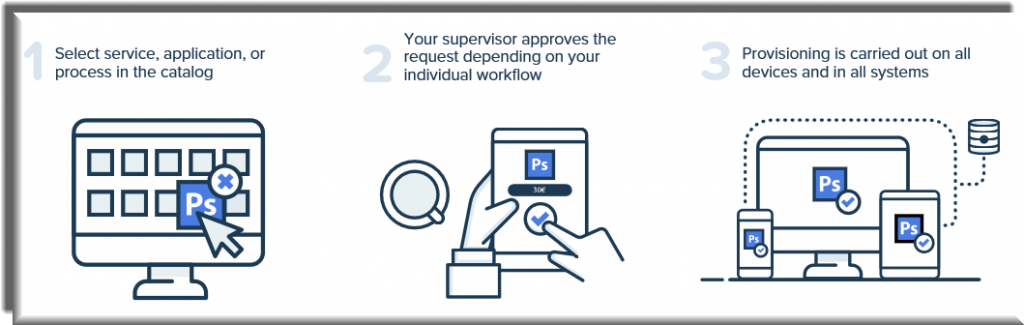 Matrix42 Service Catalogue allows end users to request services, applications or processes and allows approvals based on workflow and automatic provisioning on ALL devices and systems.